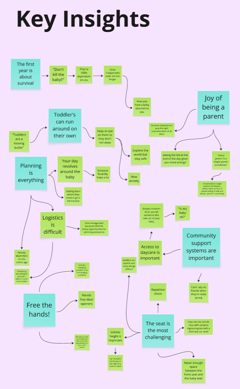 Then we conducted 3 interviews with 3 single parents, each from a different socio-economic background. Questions were raised around mobility, multi-tasking, external help and functional car designs.